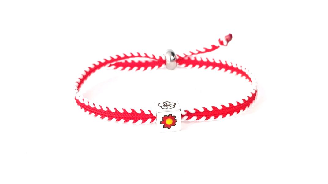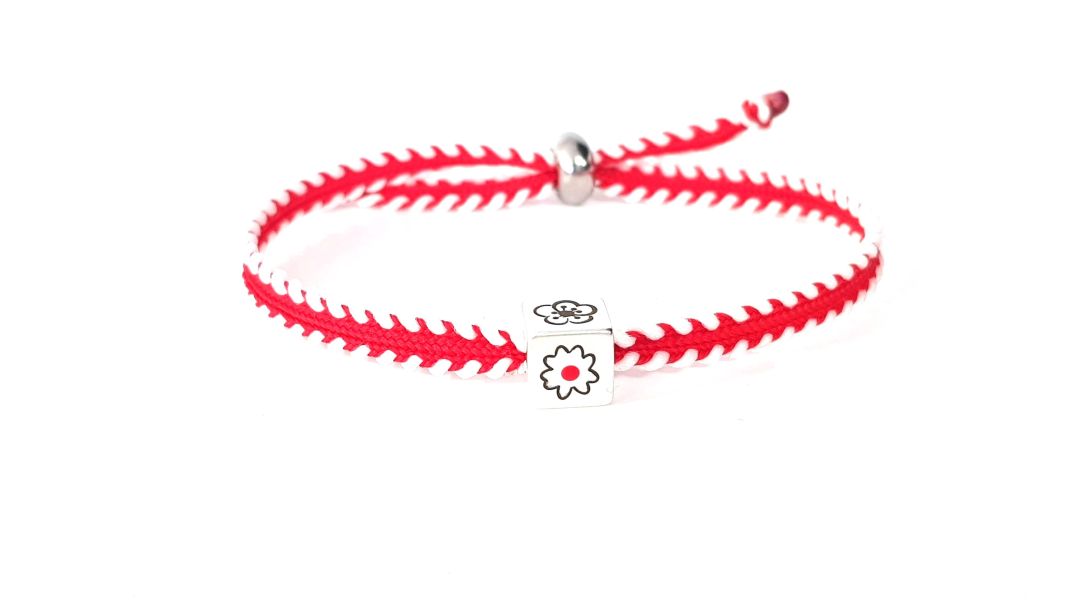 Βραχιόλι “Μάρτης” από κόκκινο και λευκό κορδόνι με μεταλλικό κύβο σε ασημί χρώμα, που περιμετρικά φέρει ζωγραφισμένα λουλούδια. Διαθέτει ατσάλινη “έξυπνη μπίλια” κούμπωμα, ώστε να προσαρμόζεται στον καρπό τραβώντας τις άκρες του κορδονιού.
