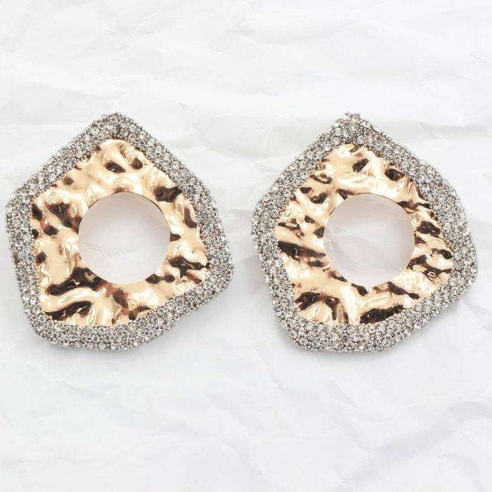 Σκουλαρίκια nickel free με μεταλλική επιφάνεια χρυσού χρώματος και ακατέργαστης όψης, διακοσμημένα με λευκά κρυσταλλάκια.