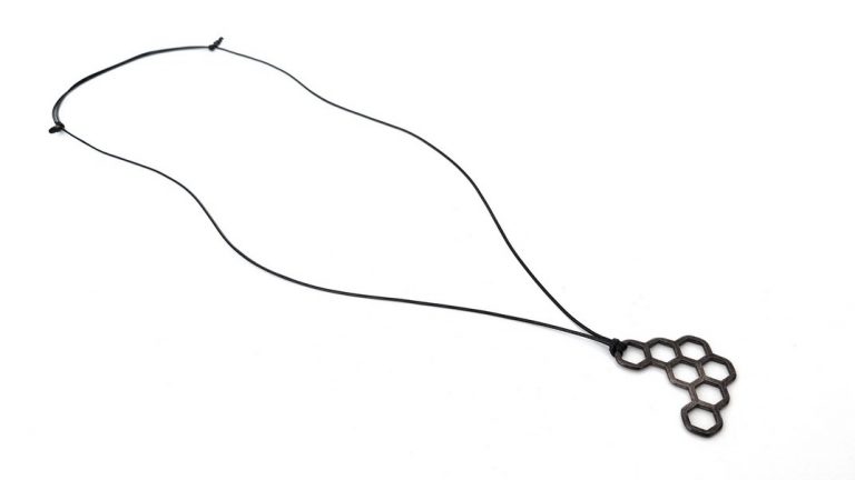 Κολιέ με μεταλλικό στοιχείο “κυψέλη” κρεμασμένο σε μαύρο ή κόκκινο κορδόνι. Χωρίς κούμπωμα, προσαρμόζεται στο ύψος που επιθυμείτε, τραβώντας τα δύο κορδόνια στο τελείωμα.