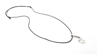 Κολιέ με μεταλλικό αγκίστρι κρεμασμένο σε μαύρο ή κόκκινο κορδόνι. Χωρίς κούμπωμα, προσαρμόζεται στο ύψος που επιθυμείτε, τραβώντας τα δύο κορδόνια στο τελείωμα.