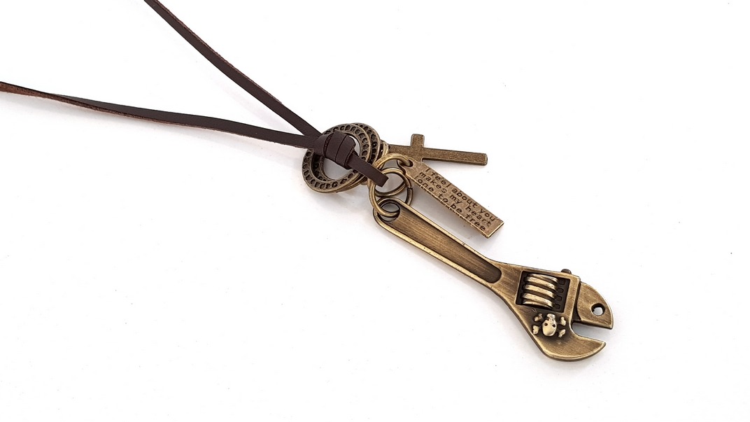 Ανδρικό κολιέ με καφέ κορδόνι από συνθετικό δέρμα και μεταλλικά διακοσμητικά σε μπρονζέ χρώμα. Χωρίς κούμπωμα, προσαρμόζεται στο ύψος που επιθυμείτε.