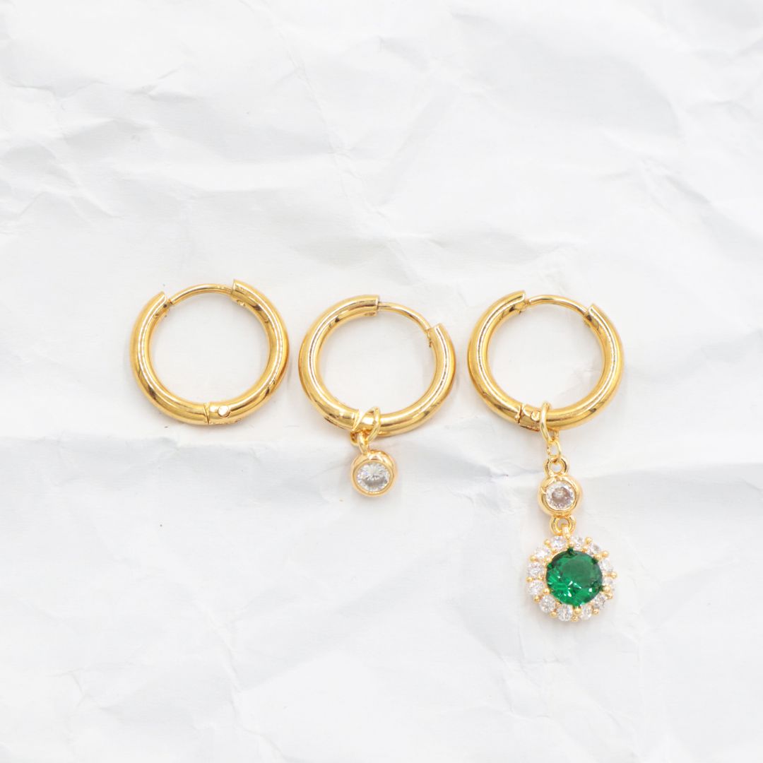 Σετ από 3 ατσάλινα σκουλαρίκια κρικάκια, 1 με στρογγυλό πράσινο κρυσταλλάκι, 1 με λευκό κρυσταλλάκι και 1 σκέτο, σε χρυσό χρώμα. Φοριούνται και τα τρία μαζί σε ένα αυτί (αν διαθέτετε 3 τρύπες).