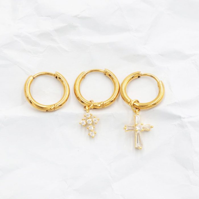 Σετ από 3 ατσάλινα σκουλαρίκια κρικάκια, 1 με σταυρό από λευκά κρυσταλλάκια, 1 με πιο μικρό σταυρό με λευκά στρασάκια και ένα σκέτο, σε χρυσό χρώμα. Φοριούνται και τα τρία μαζί σε ένα αυτί (αν διαθέτετε 3 τρύπες).