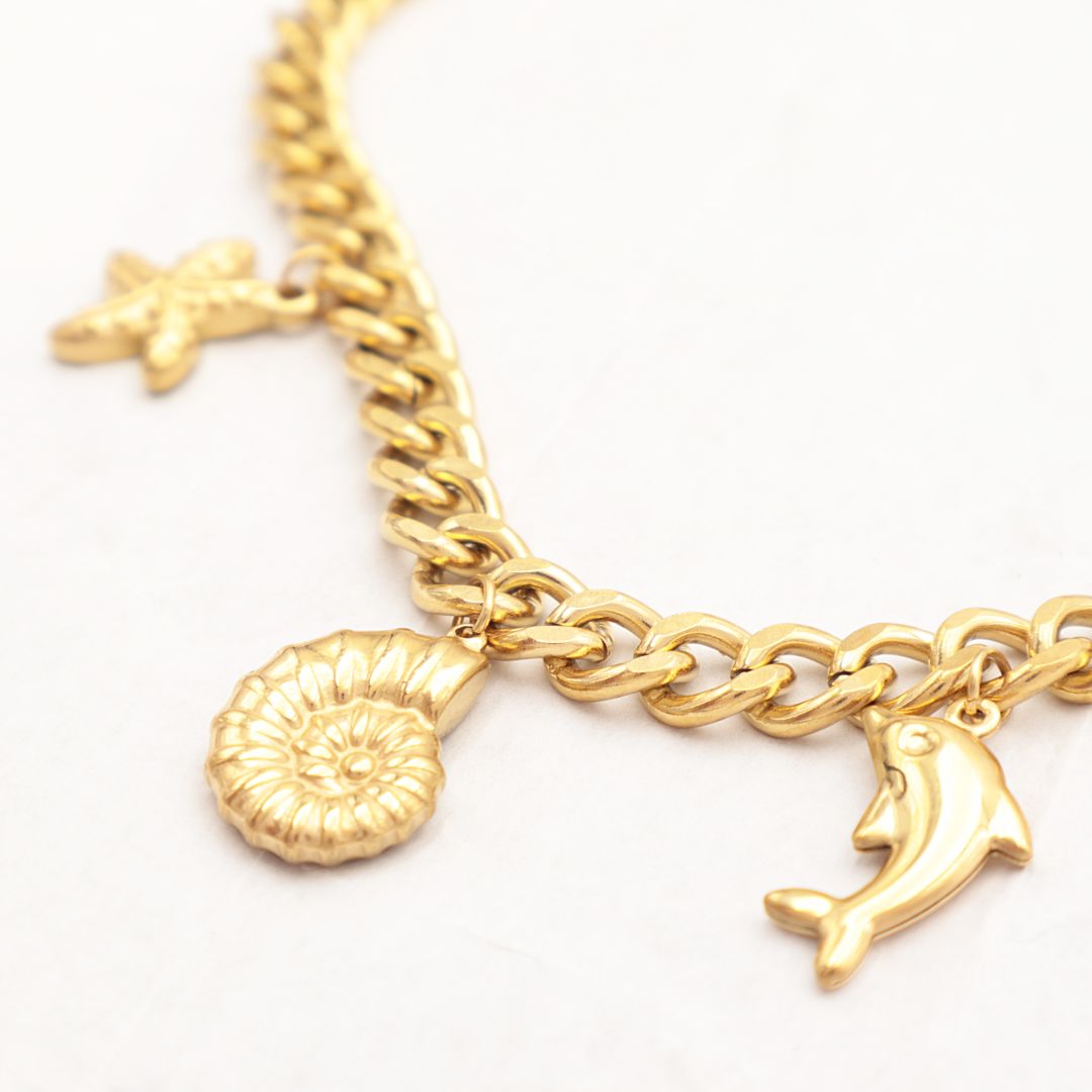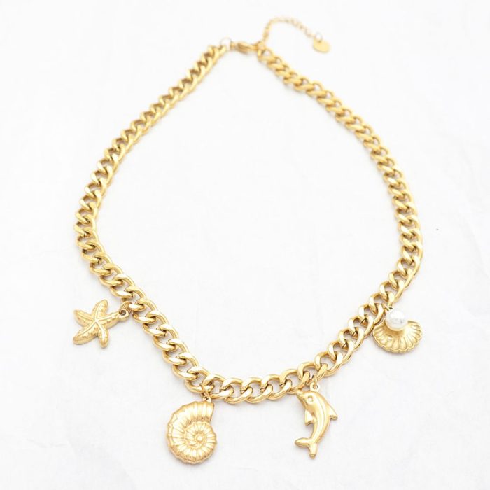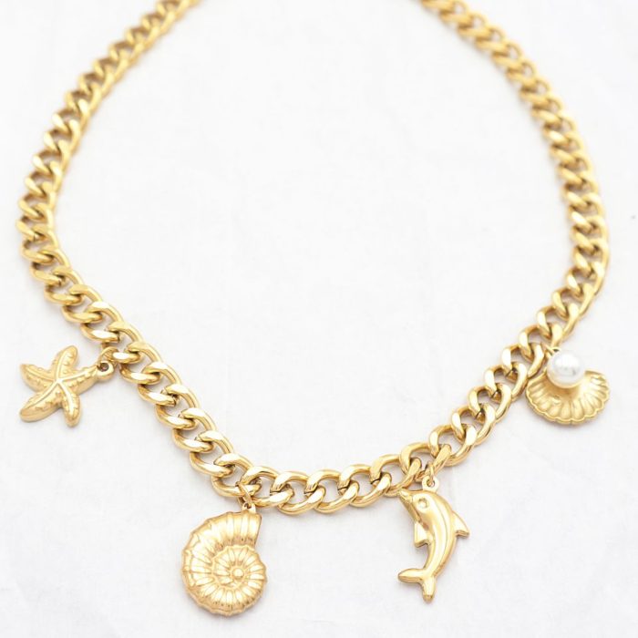 Κοντό ατσάλινο κολιέ αλυσίδα με κρεμαστά καλοκαιρινά στοιχεία (κοχύλι με πέρλα, δελφίνι, όστρακο και αστερίας).