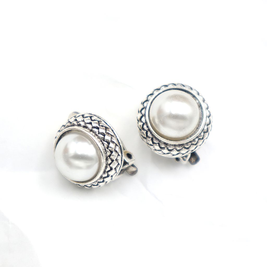 Κοντά σκουλαρίκια με κλιπ (κατάλληλα για μη τρυπημένα αυτιά), σε ασημί χρώμα, διακοσμημένα με πέρλα.