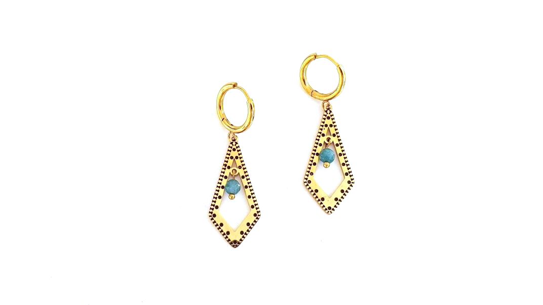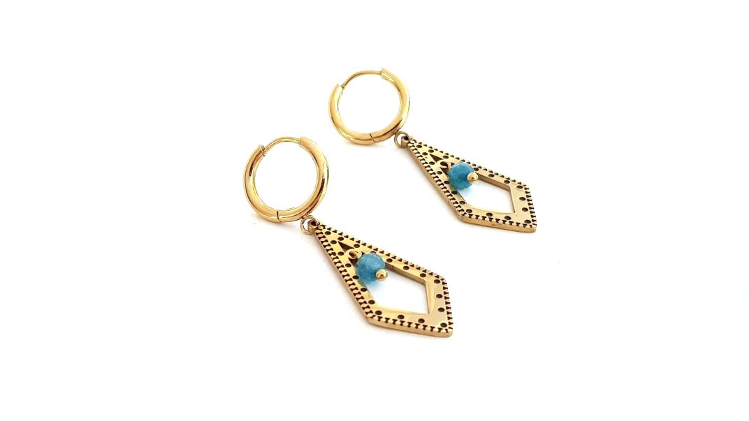 Ατσάλινα boho σκουλαρίκια με μικρούς κρίκους, σε χρυσό χρώμα, με μικρή μπλε πέτρα και γεωμετρικό σχήμα.