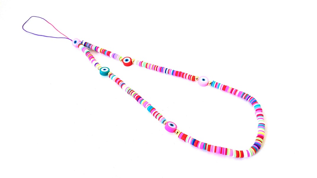 Κρεμαστό λουράκι λαιμού για κινητό, από λεπτές πολύχρωμες χάντρες (κυρίως ροζ) και διακοσμημένο με ματάκια.