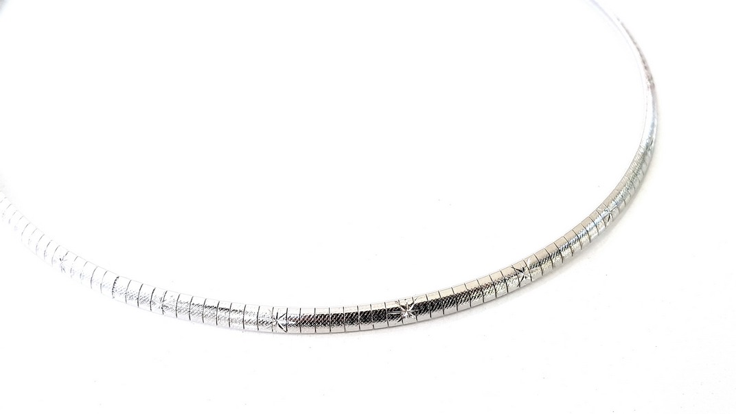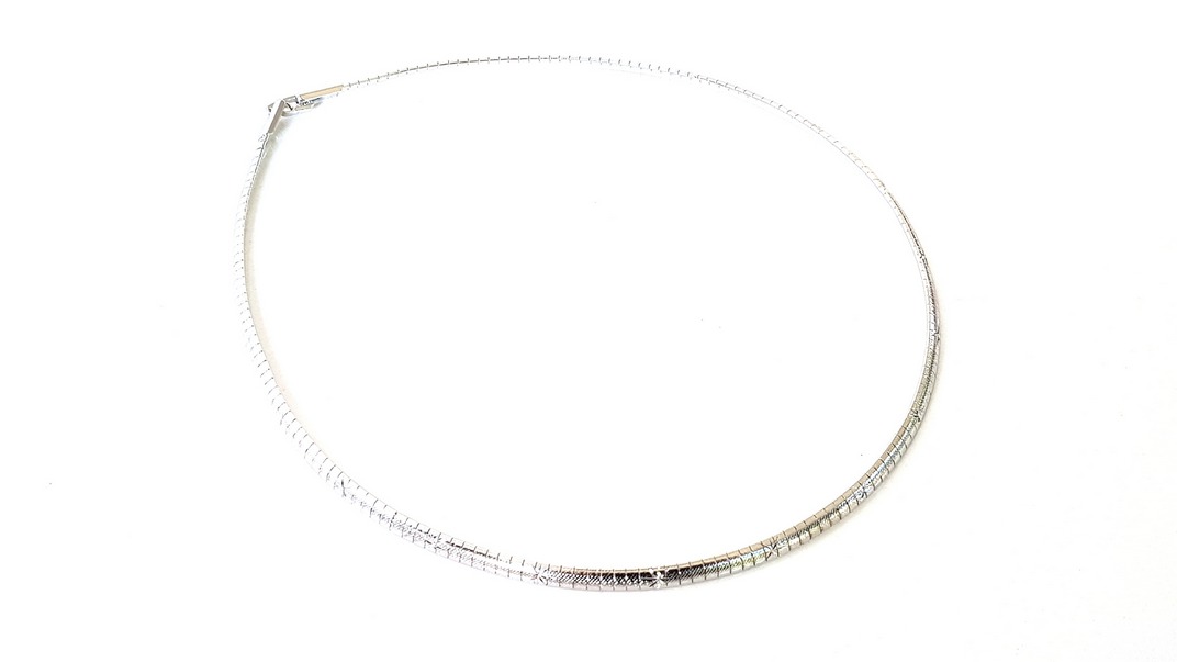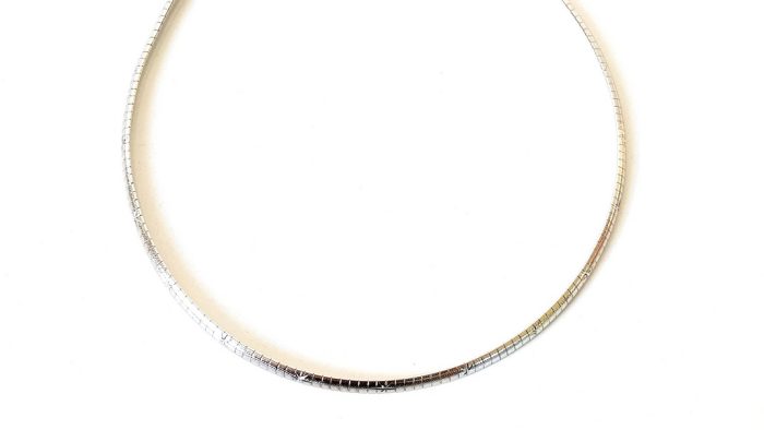 Κοντό κολιέ από πλακέ πυκνή αλυσίδα, με επαργύρωση μεγάλης αντοχής (παρόμοια με αυτή των ατσάλινων), σε ασημί χρώμα.