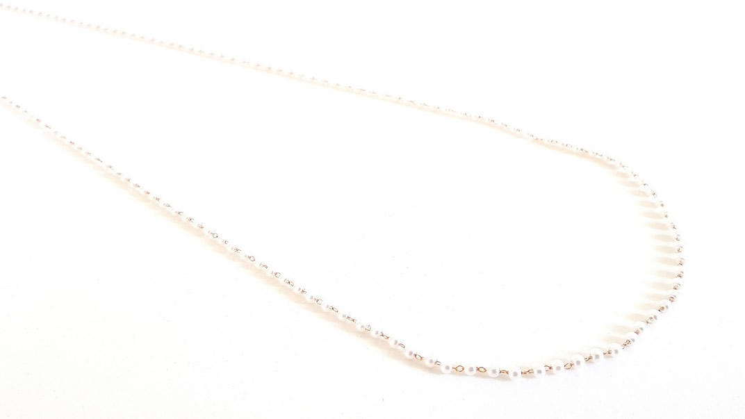 Κολιέ ροζάριο με ψιλές λευκές κρυστάλλινες χάντρες, με μεταλλικούς συνδέσμους σε ροζ-χρυσό χρώμα.  Διαθέτει αλυσιδάκι επέκτασης.