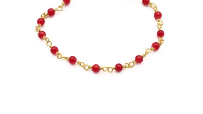Ατσάλινο βραχιόλι με ψιλές κόκκινες χάντρες και ατσάλινες ενώσεις σε χρυσό χρώμα. Κούμπωμα με παπαγαλάκι. Διαθέτει αλυσιδάκι αυξομείωσης για να προσαρμόζεται στο χέρι σας.