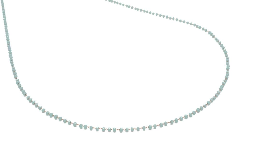 Κολιέ ροζάριο με ψιλές σιελ κρυστάλλινες χάντρες, με ατσάλινους συνδέσμους σε ροζ χρυσό χρώμα. Διαθέτει αλυσιδάκι επέκτασης.