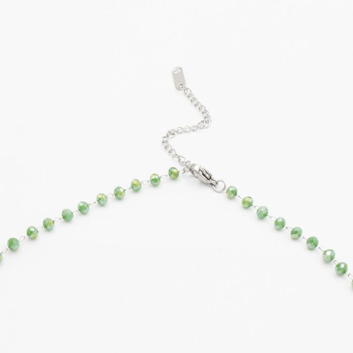 Κοντό κολιέ ροζάριο με ψιλές πράσινο ανοικτό και ιριδίζουσες κρυστάλλινες χάντρες, με ατσάλινους συνδέσμους σε ασημί χρώμα. Διαθέτει αλυσιδάκι επέκτασης.