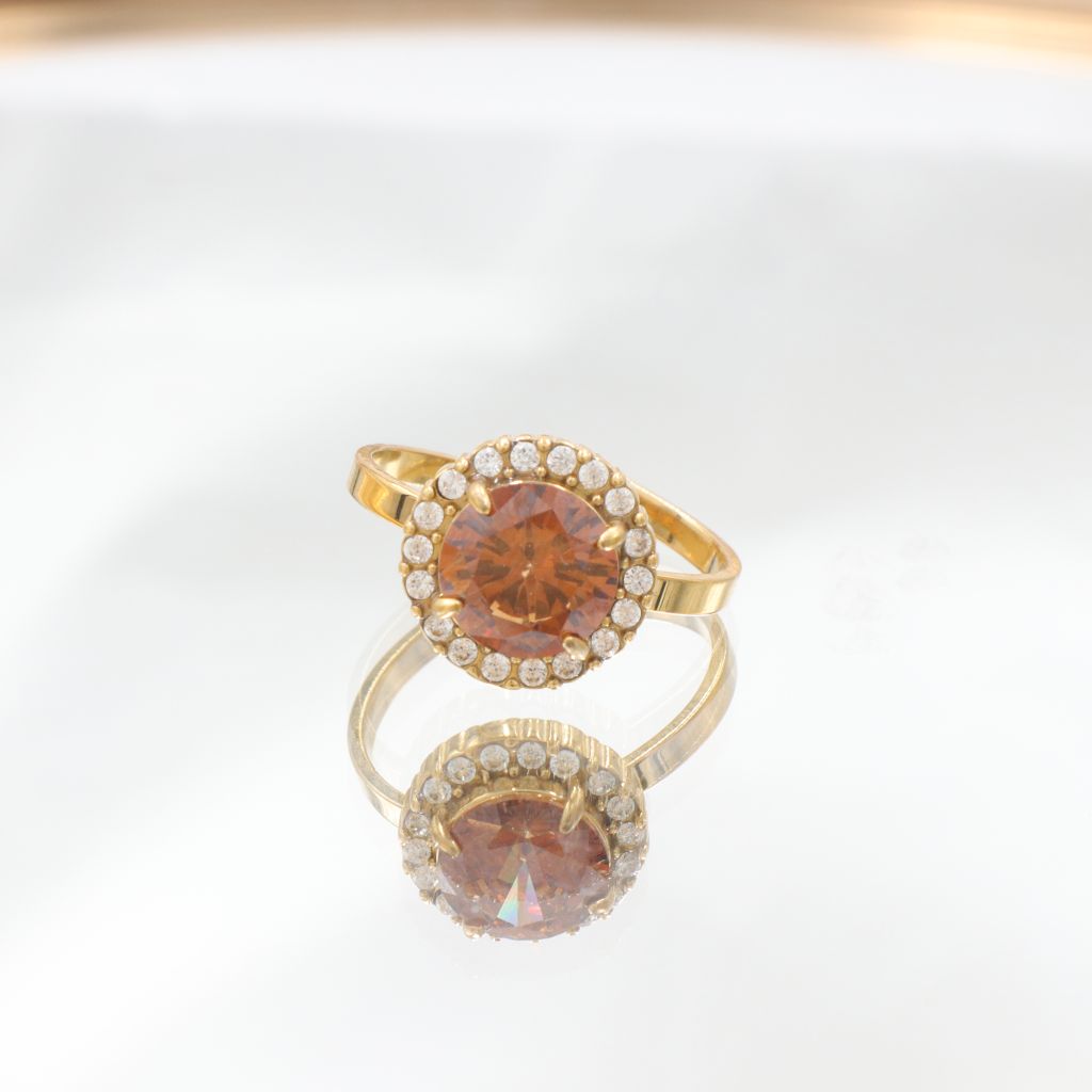 Aτσάλινο δαχτυλίδι με ανοιχτή καφέ κρυστάλλινη πέτρα σε στρογγυλό σχήμα και περιμετρική διακόσμηση με λευκα στρας, τα οποία αναδεικύουν την πανέμορφη πέτρα στο κέντρο.