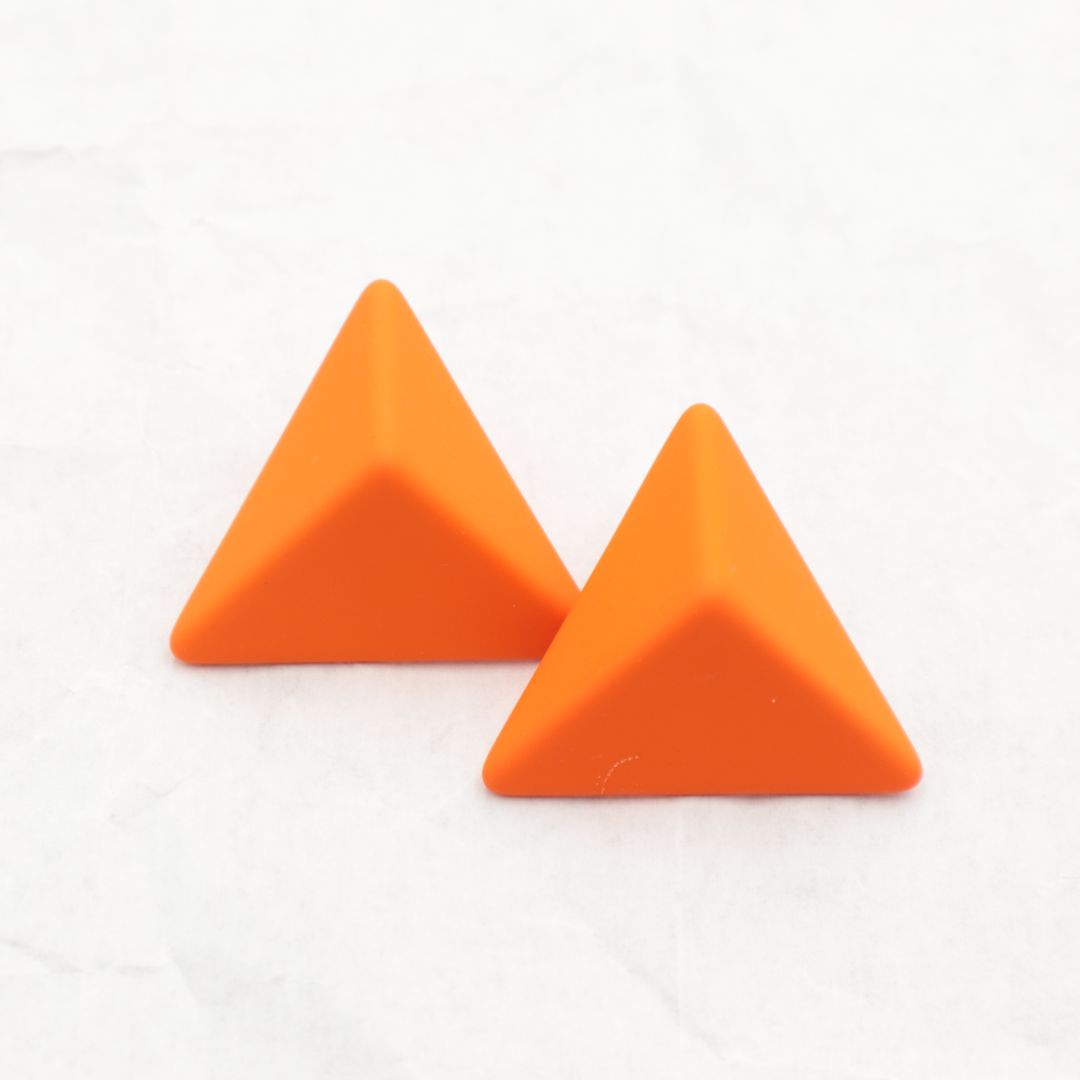 Σκουλαρίκια με καρφάκι, και μεγάλες τρισδιάστατες πυραμίδες, με υφή που θυμιζει γόμα, σε πορτοκαλί. Διαθέσιμα και σε άλλα χρώματα για fun συνδυασμούς.