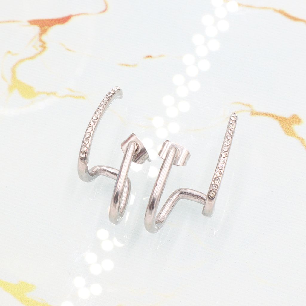 Ατσάλινα σκουλαρίκια Diplo, σε ασημί χρώμα, διακοσμημένα με λευκά στρας. Είναι φτιαγμένα από ανοξείδωτο ατσάλι. Κάνε δικά σου δύο σκουλαρίκια σε ένα, καθώς όταν φορεθούν, μοιάζουν σαν δύο φορεμένα σκουλαρίκια.