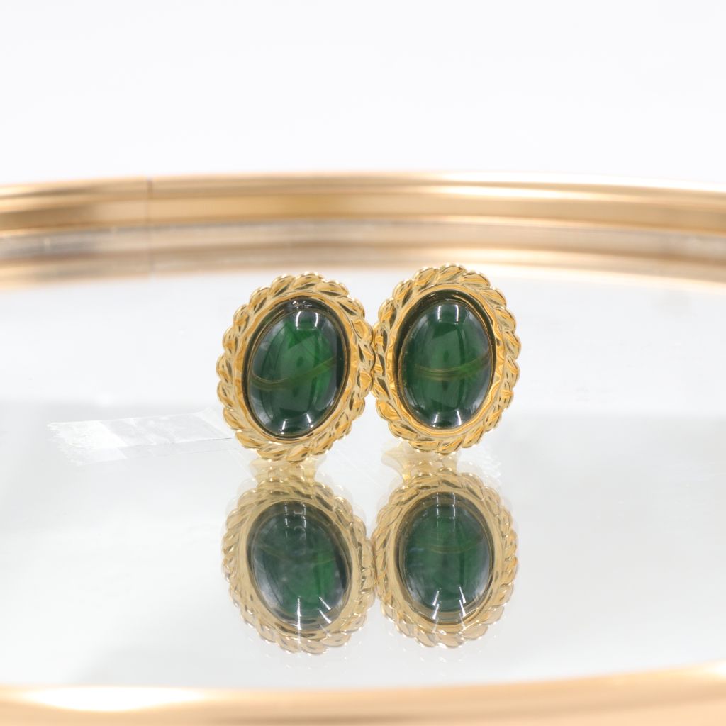 Ατσάλινα σκουλαρίκια με κλιπ (κατάλληλα για μη τρυπημένα αυτιά), σε χρυσό χρώμα, με οβάλ σκούρη πράσινη πέτρα και vintage ύφος. Κουμπώνει με κλιπ χωρίς να πονάει και είναι ελαφρύ και άνετο. Ανακάλυψε σκουλαρίκια για αυτιά χωρίς τρύπες εδώ: σκουλαρίκια με κλιπ