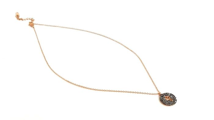 Κοντό ατσάλινο κολιέ σε ροζ χρυσό χρώμα, με λεπτή αλυσίδα και κρεμαστό στρογγυλό στοιχείο με μαύρα στρας και σταυρό στο κέντρο.