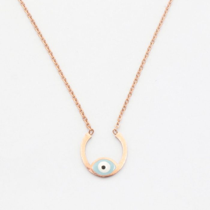 Κοντό ατσάλινο κολιέ σε ροζ χρυσό χρώμα, με γαλάζιο μάτι. Διαθέτει αλυσιδάκι επέκτασης.