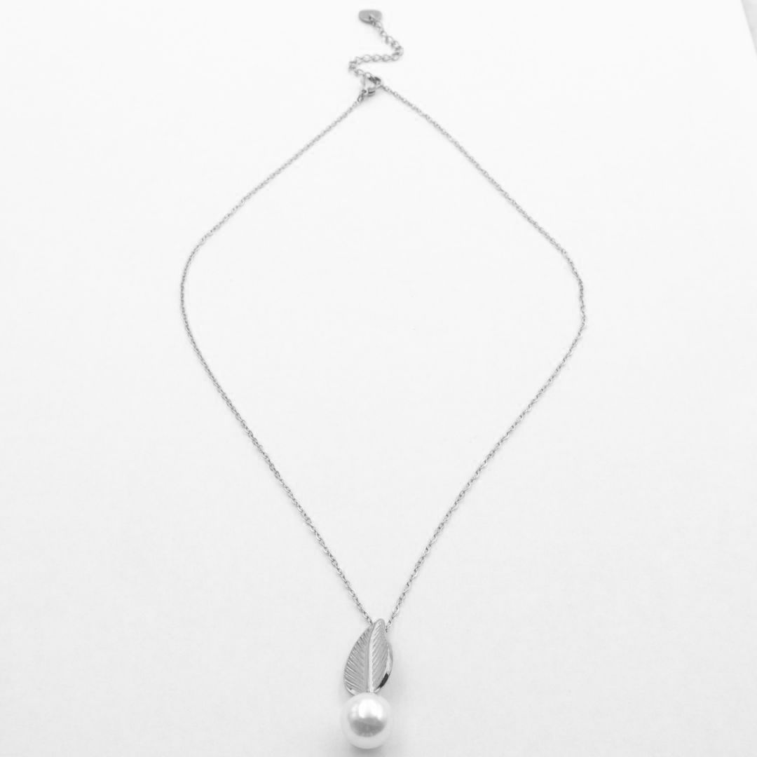 Ατσάλινο κοντό κολιέ με στοιχείο φύλλο και πέρλα, σε ασημί χρώμα. Κούμπωμα με παπαγαλάκι. Διαθέτει αλυσιδάκι επέκτασης.