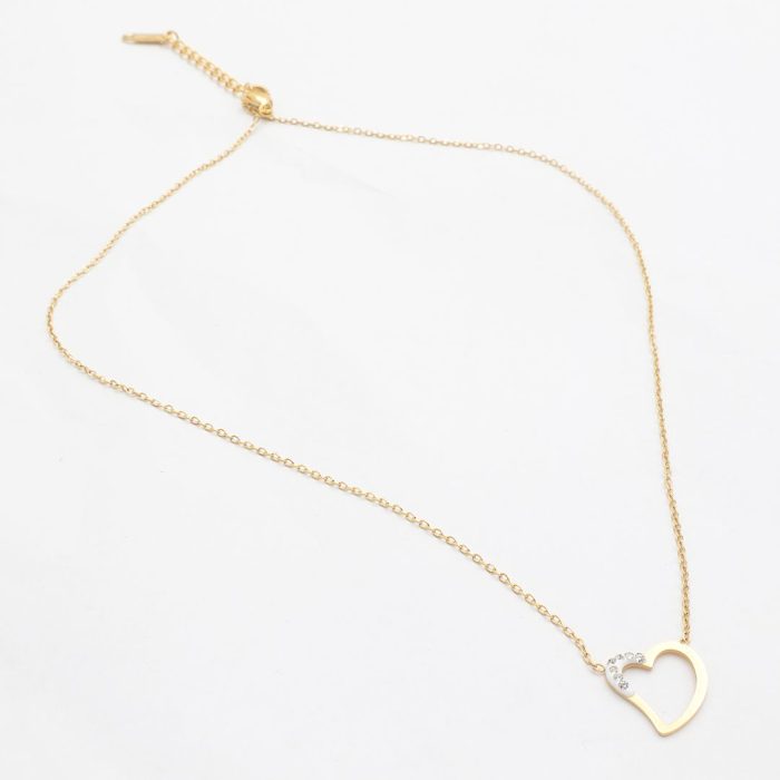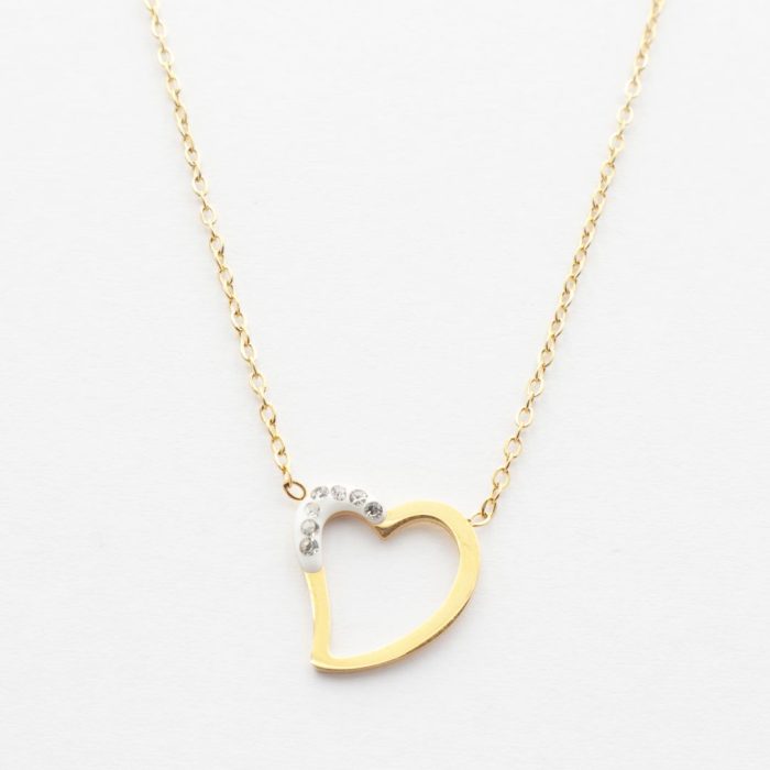 Κοντό ατσάλινο κολιέ σε χρυσό χρώμα, με καρδιά διακοσμημένη με λευκάς στρας σε ένα κομματι της. Διαθέτει αλυσιδάκι επέκτασης.