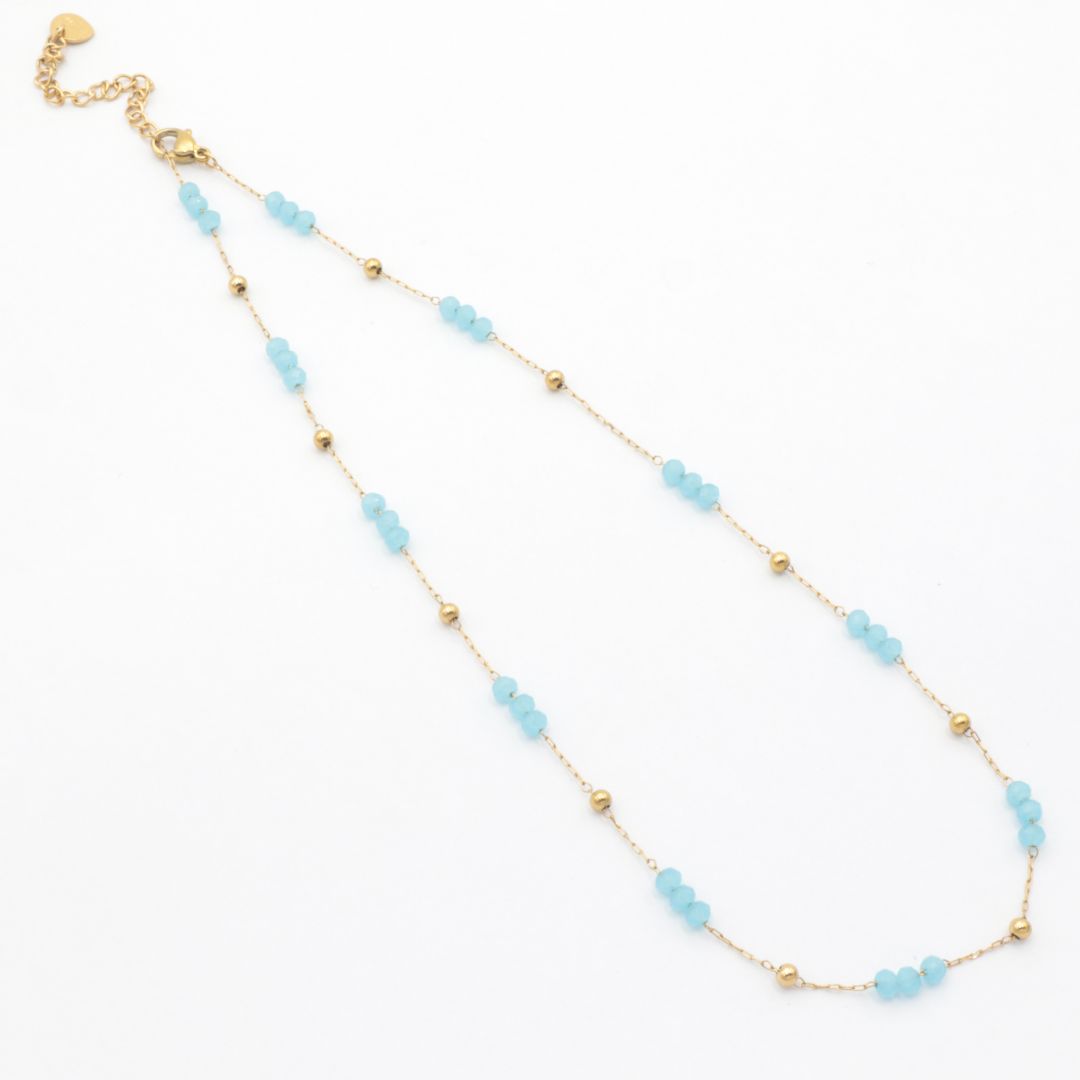 Κοντό ατσάλινο κολιέ σε χρυσό χρώμα, με γαλάζια κρυσταλλάκια. Διαθέτει αλυσιδάκι επέκτασης.