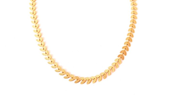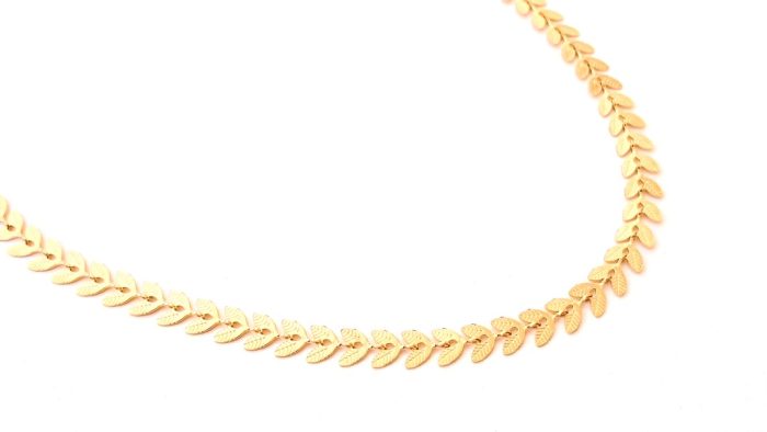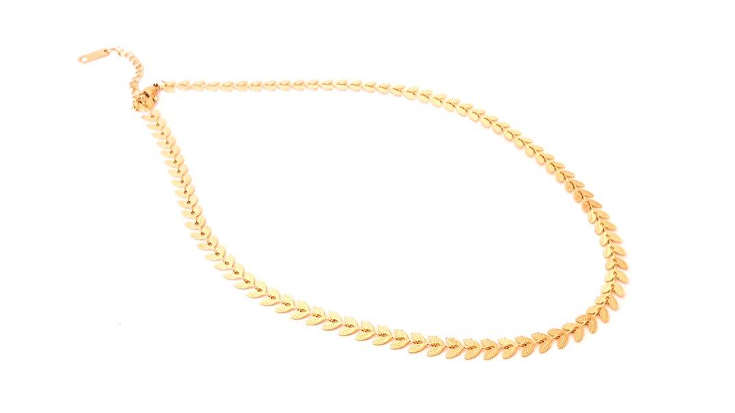 Κοντό ατσάλινο κολιέ σε ροζ χρυσό χρώμα με πλακέ αλυσίδα που αποτελείται από διπλά φυλλαράκια. Διαθέτει αλυσιδάκι επέκτασης.