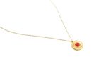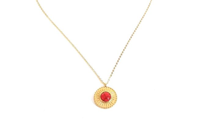Κοντό ατσάλινο κολιέ σε χρυσό χρώμα, με λεπτή αλυσίδα και κρεμαστό στρογγυλό στοιχείο με ανάγλυφες ακτίνες και κόκκινη μικρή πέτρα στο κέντρο.
