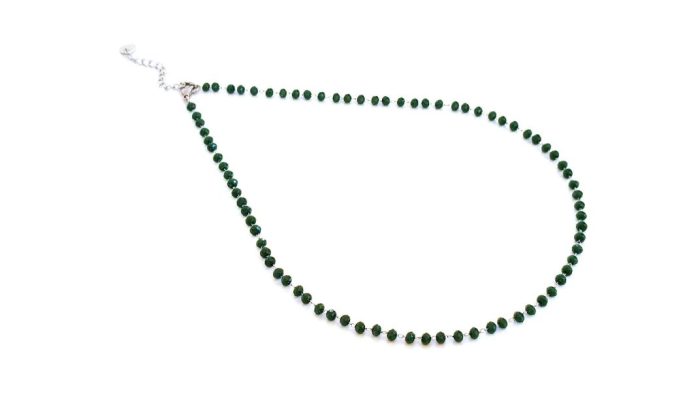 Κοντό κολιέ ροζάριο με ψιλές πράσινες σκούρες κρυστάλλινες χάντρες, με ατσάλινους συνδέσμους σε ασημί χρώμα. Διαθέτει αλυσιδάκι επέκτασης.