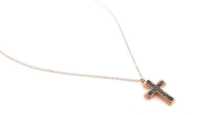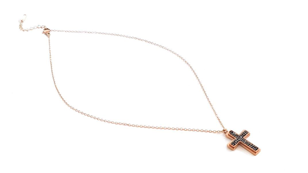 Κοντό ατσάλινο κολιέ σε ροζ χρυσό χρώμα, με λεπτή αλυσίδα και κρεμαστό μεγάλο σταυρό με μαύρα στρας.