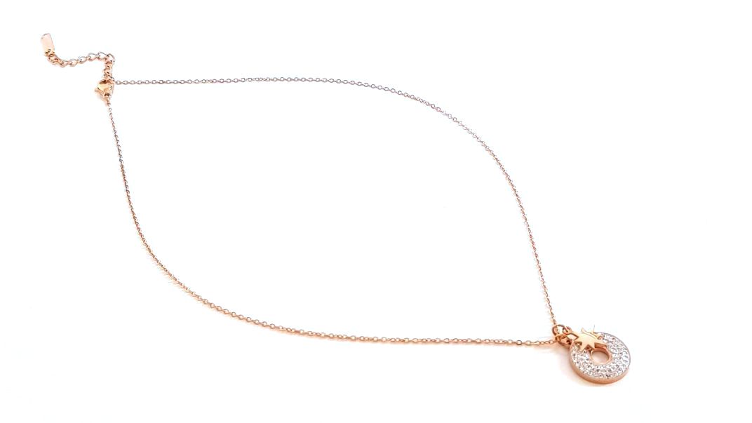 Κοντό ατσάλινο κολιέ σε ροζ χρυσό χρώμα, με λεπτή αλυσίδα, ατσάλινο στρογγυλό στοιχείο με αστέρι με λευκά στρας κι έξτρα μικρό κρεμαστό ατσάλινο αστέρι. Διαθέτει αλυσιδάκι επέκτασης.