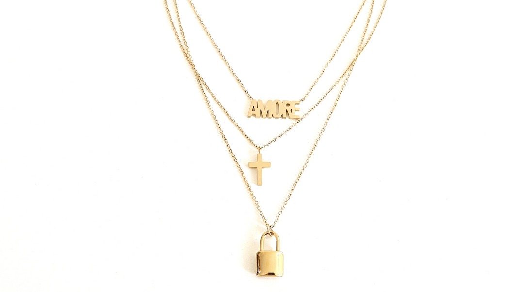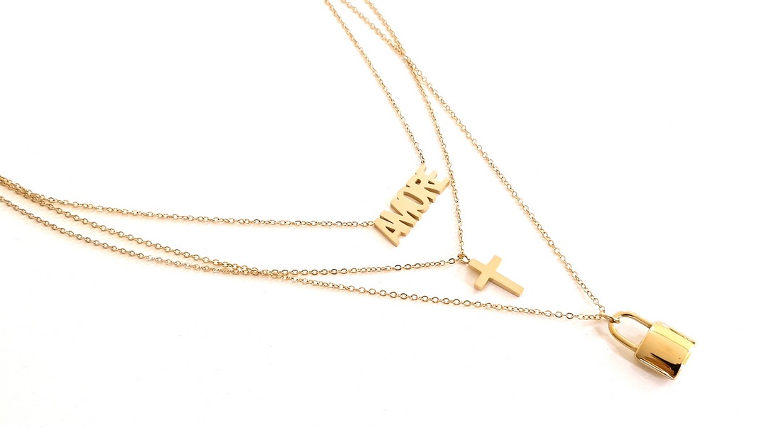 Κοντό κολιέ με 3 σειρές από λεπτή επιχρυσωμένη ατσάλινη αλυσίδα σε χρυσό χρώμα και κρεμαστά στοιχεία: AMORE, σταυρό και λουκέτο.