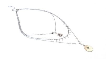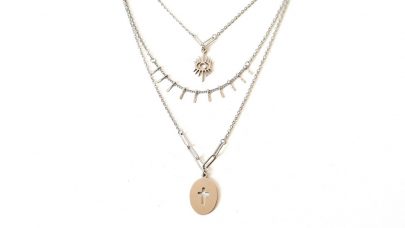 Κοντό τριπλό κολιέ από ατσάλι, σε ασημί χρώμα, με κρεμαστό σταυρό και μάτι. Διαθέτει αλυσιδάκι επέκτασης.