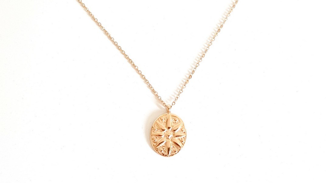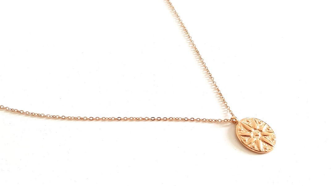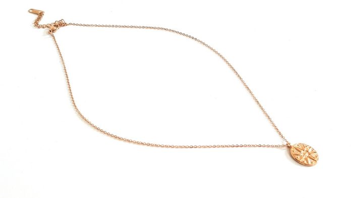 Κοντό κολιέ σε ροζ-χρυσό χρώμα με ατσάλινη αλυσίδα και οβάλ στοιχείο με ανάγλυφο αστέρι που μοιάζει με αυτό της Βεργίνας. Διαθέτει αλυσιδάκι επέκτασης.