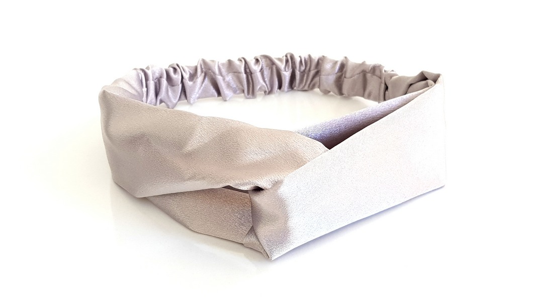Κορδέλα μαλλιών από απαλό ύφασμα με ελαφριά γυαλάδα, με λάστιχο στο πίσω μέρος και σχέδιο με στρίψιμο στο πάνω μέρος.