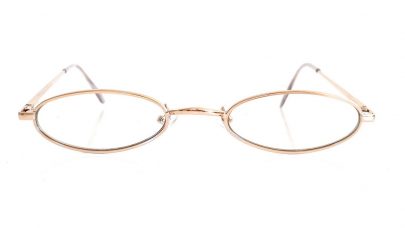 Vintage μικρά γυαλιά, με λεπτό μεταλλικό σκελετό σε χρυσό χρώμα και στενούς οβαλ διάφανους φακούς.
