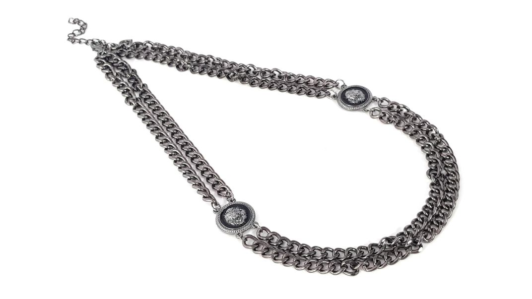 Κοντό κολιέ από διπλή αλυσίδα σε ανθρακί χρώμα και μεταλλικούς συνδέσμους με σκαλιστό λιοντάρι. Διαθέτει αλυσιδάκι επέκτασης.