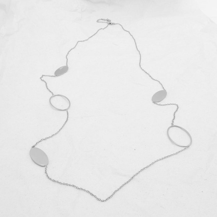 Ατσάλινη μακριά και λεπτή αλυσίδα λαιμού σε ασημί χρώμα, με οβάλ στοιχεία κατά μήκος της. Διαθέτει αλυσιδάκι επέκτασης.