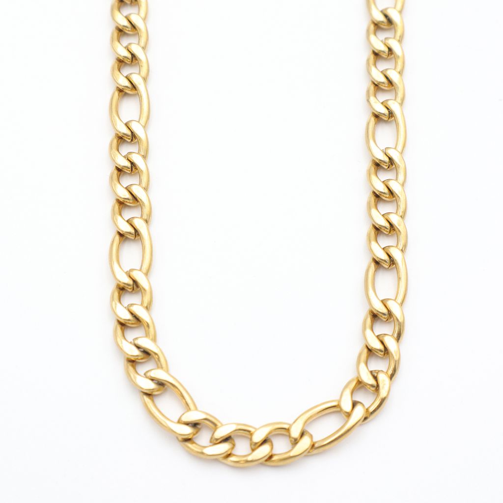 Ατσάλινη αλυσίδα λαιμού figaro, σε χρυσό χρώμα. Το ανοξείδωτο ατσάλι σε συνδυασμό με τη σωστή επιχρύσωση καθιστά την αλυσίδα ανθεκτική σε νερό και ιδρώτα, άρα και ιδανική για όλες σου τις δραστηριότητες.