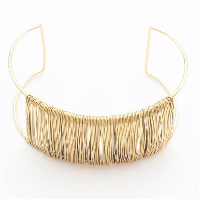 Ατσάλινο βραχιόλι τύπου χειροπέδα, σε χρυσό χρώμα, με τυλιγμένο ατσάλινο σύρμα. Αυξομειώνεται με πίεση στα άκρα.