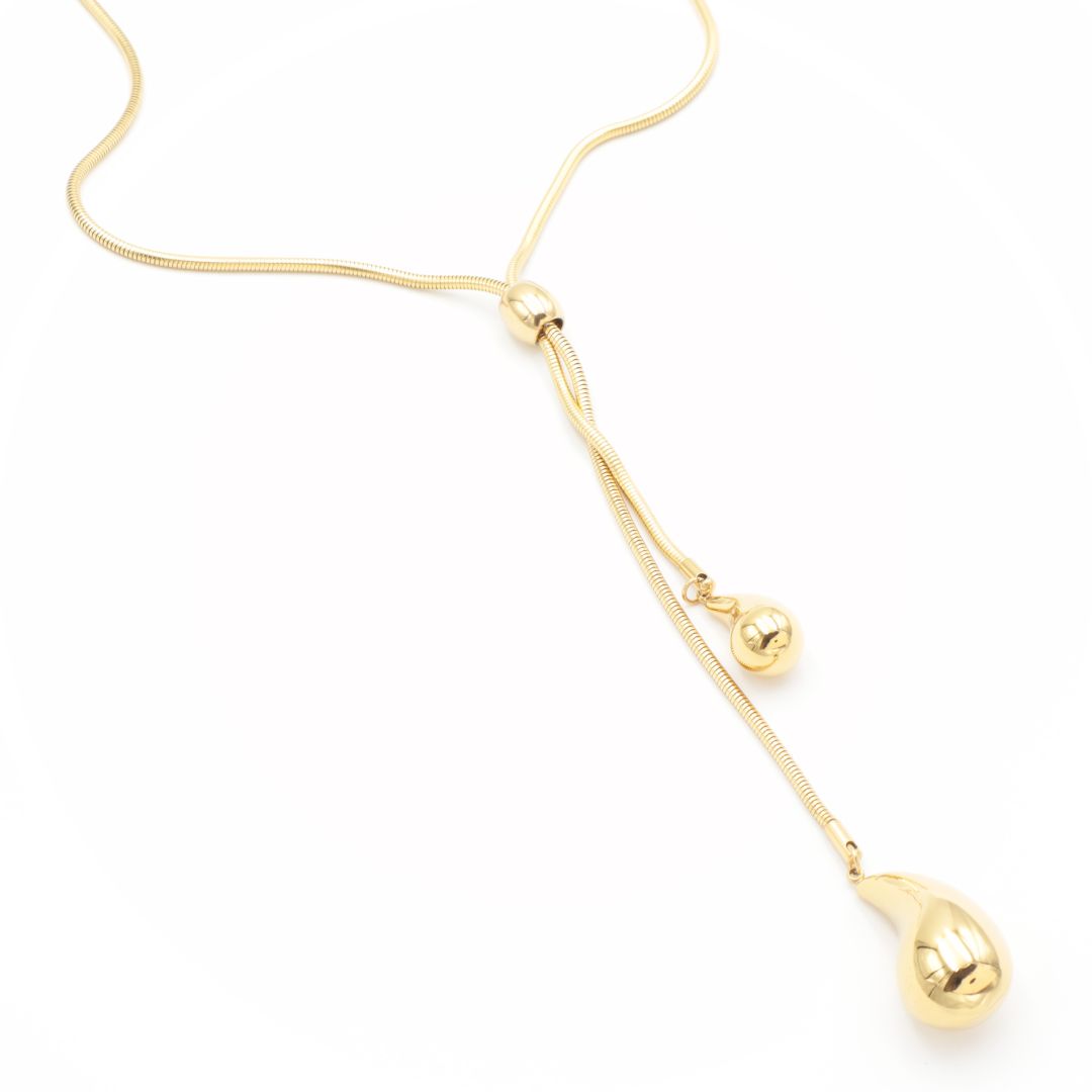 Ατσάλινο μακρύ κολιέ σε χρυσό χρώμα, με 2 μεγάλες κρεμαστές σταγόνες και ιδιαίτερη κυλινδρική αλυσίδα. Διαθέτει αλυσιδάκι επέκτασης.