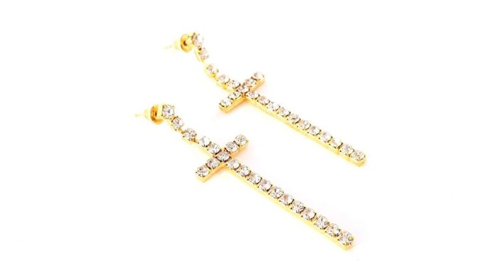 Μακριά κρεμαστά σκουλαρίκια με καρφάκι, σε χρυσό χρώμα, σε σχήμα σταυρού με λευκά στρας.