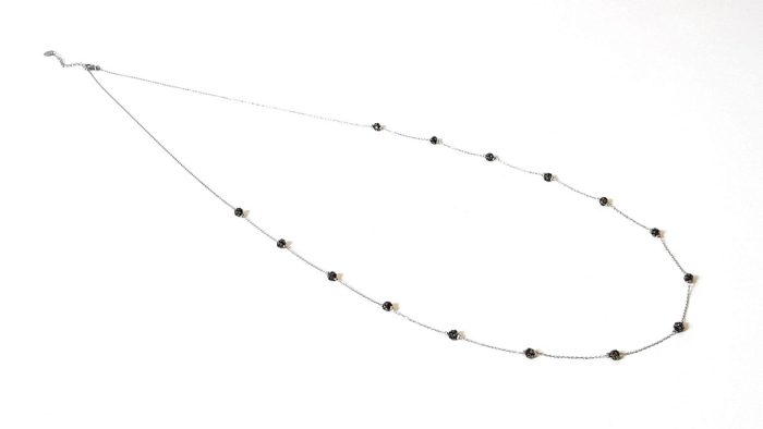 Μακρύ ατσάλινο κολιέ, με λεπτή ατσάλινη αλυσίδα σε ασημί χρώμα και χαντρούλες με γκρι στρας. Το κολιέ διαθέτει αλυσιδάκι επέκτασης ώστε να προσαρμόζεται στο ύψος που θέλετε.
