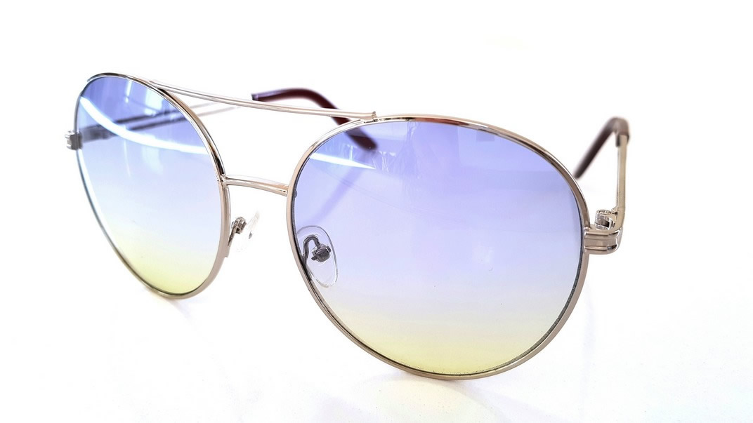 Γυαλιά ηλίου σε στυλ aviator με στρογγυλεμένο φακό, με μεταλλικό σκελετό σε ασημί χρώμα και γαλάζιο-κίτρινο ντεγκραντέ φακό.