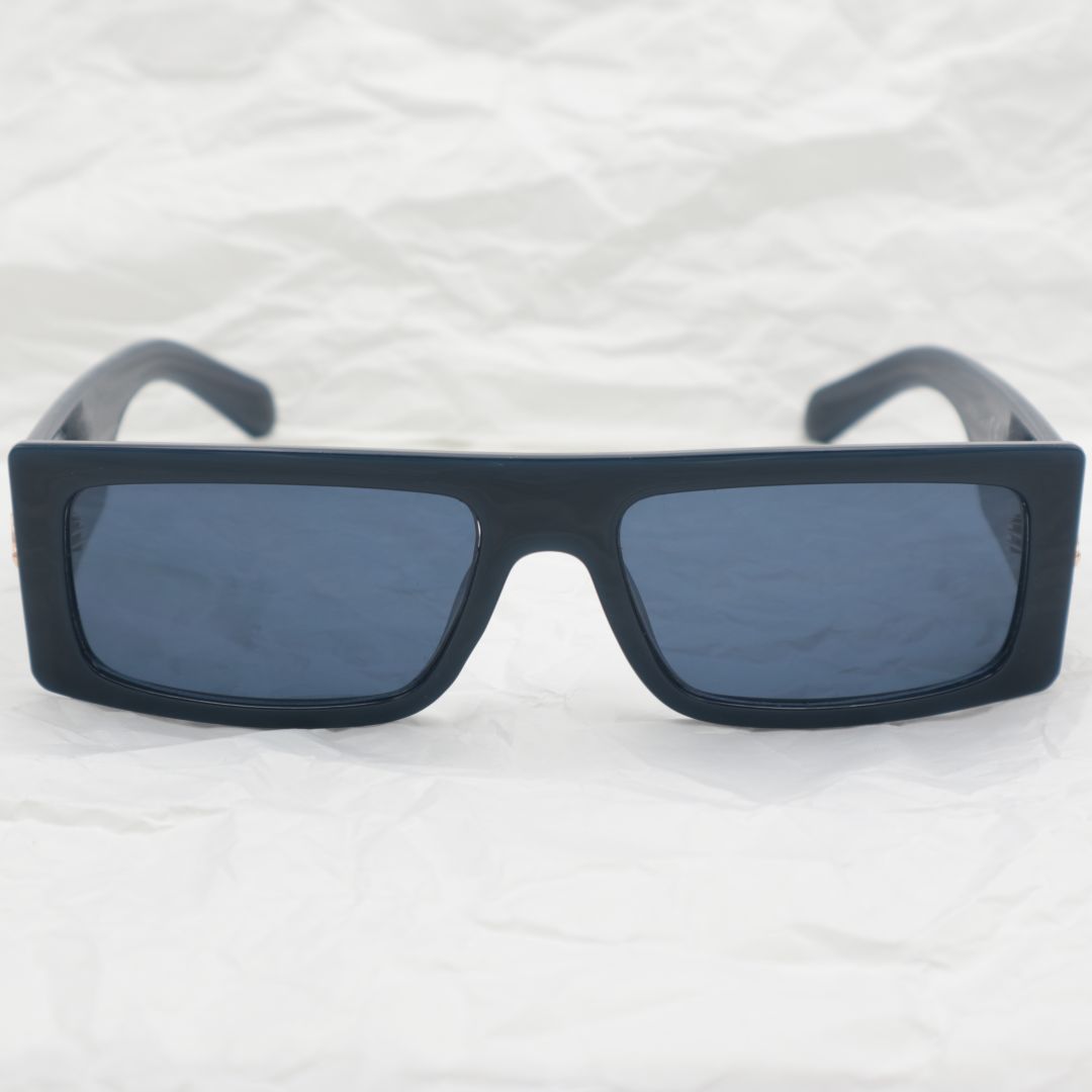 Γυαλιά ηλίου flat top με ορθογώνιους φακούς σε μπλε χρώμα και σκούρο μπλε σκελετό με χρυσό διακοσμητικό στην ένωση με τους βραχίονες.