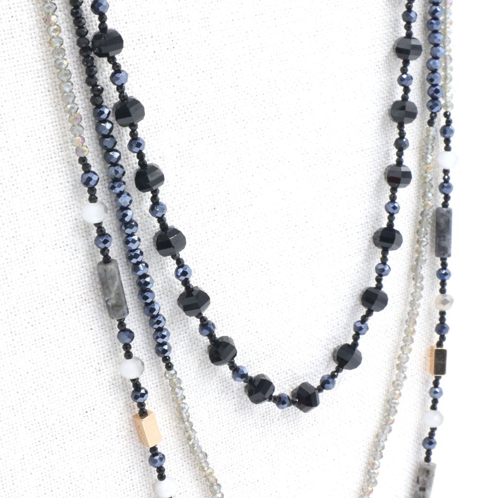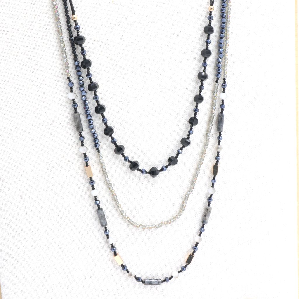 Ανακάλυψε το τριπλό κολιέ Esperanza, φτιαγμένο από 3 πιο μικρά κολιέ με πολύχρωμες χάντρες, κοντά στους χρωματισμούς του μαύρου, γκρι και μπλε. Είναι μακρύ και είναι ιδανικό για “πλούσιο” και γεμάτο κολιέ. Κάνε εύκολα και γρήγορα, το πιο όμορφο layering.
