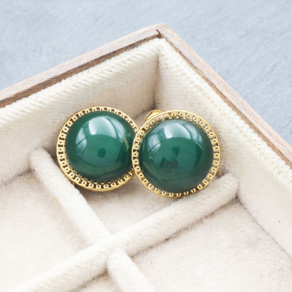 Ατσάλινα σκουλαρίκια με κλιπ (κατάλληλα για μη τρυπημένα αυτιά), σε χρυσό χρώμα, με στρογγυλή πράσινη πέτρα και vintage ύφος. Κουμπώνει με κλιπ χωρίς να πονάει και είναι ελαφρύ και άνετο. Ανακάλυψε σκουλαρίκια για αυτιά χωρίς τρύπες εδώ: σκουλαρίκια με κλιπ