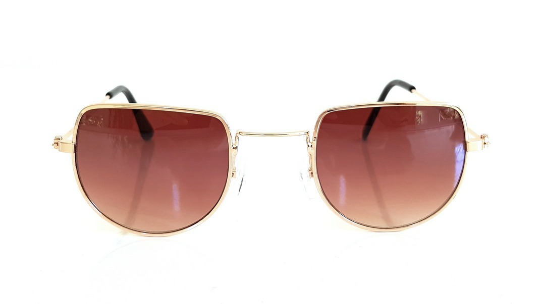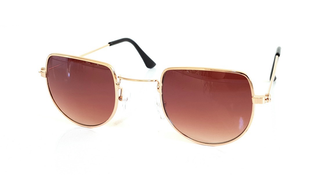 Γυαλιά ηλίου με στρογγυλεμένο χρυσό σκελετό με λεπτούς βραχίονες και καφέ ντεγκραντέ φακό.