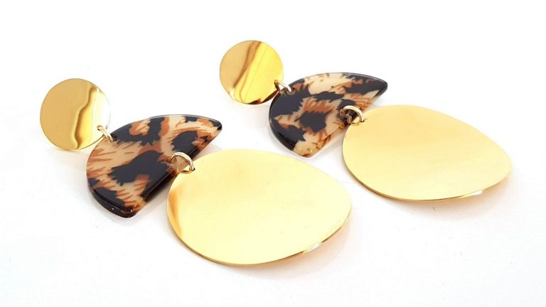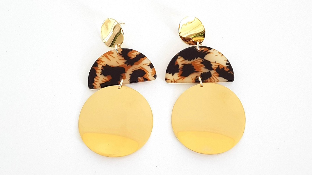 Ατσάλινα κρεμαστά σκουλαρίκια με καρφάκι, με χρυσά και animal print στοιχεία.