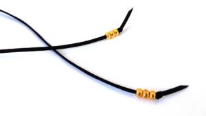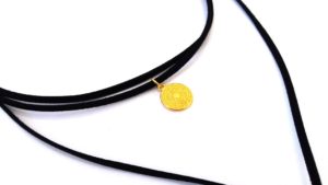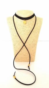 Κολιέ boho τσόκερ που τυλίγεται στο λαιμό, από μακρύ σουέτ κορδόνι και διακοσμητικό δίσκο σε χρυσό χρώμα. Τελείωμα με χρυσές μπίλιες.
